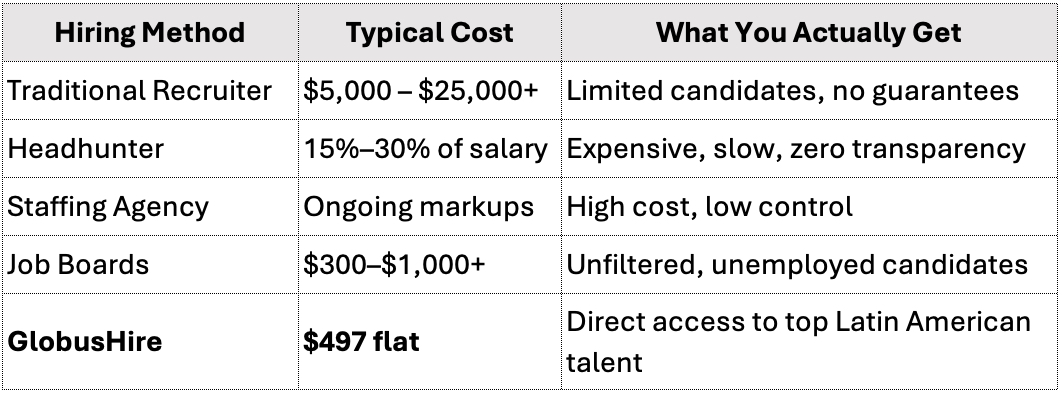 “We’ve built a 12-person support team in Latin America using GlobusHire. No recruiters, no nonsense. The ads, scripts, and contracts they include are gold. Every U.S. business owner should try it.”